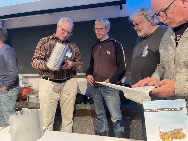 Karikaturist Andreas Locher nutzte die Gelegenheit, seine Sammlung an Modellflug-Karikaturen vorzustellen. Dieses Buch wird in Kürze über die Redaktion der Zeitschrift Modellflugsport bestellbar sein.
