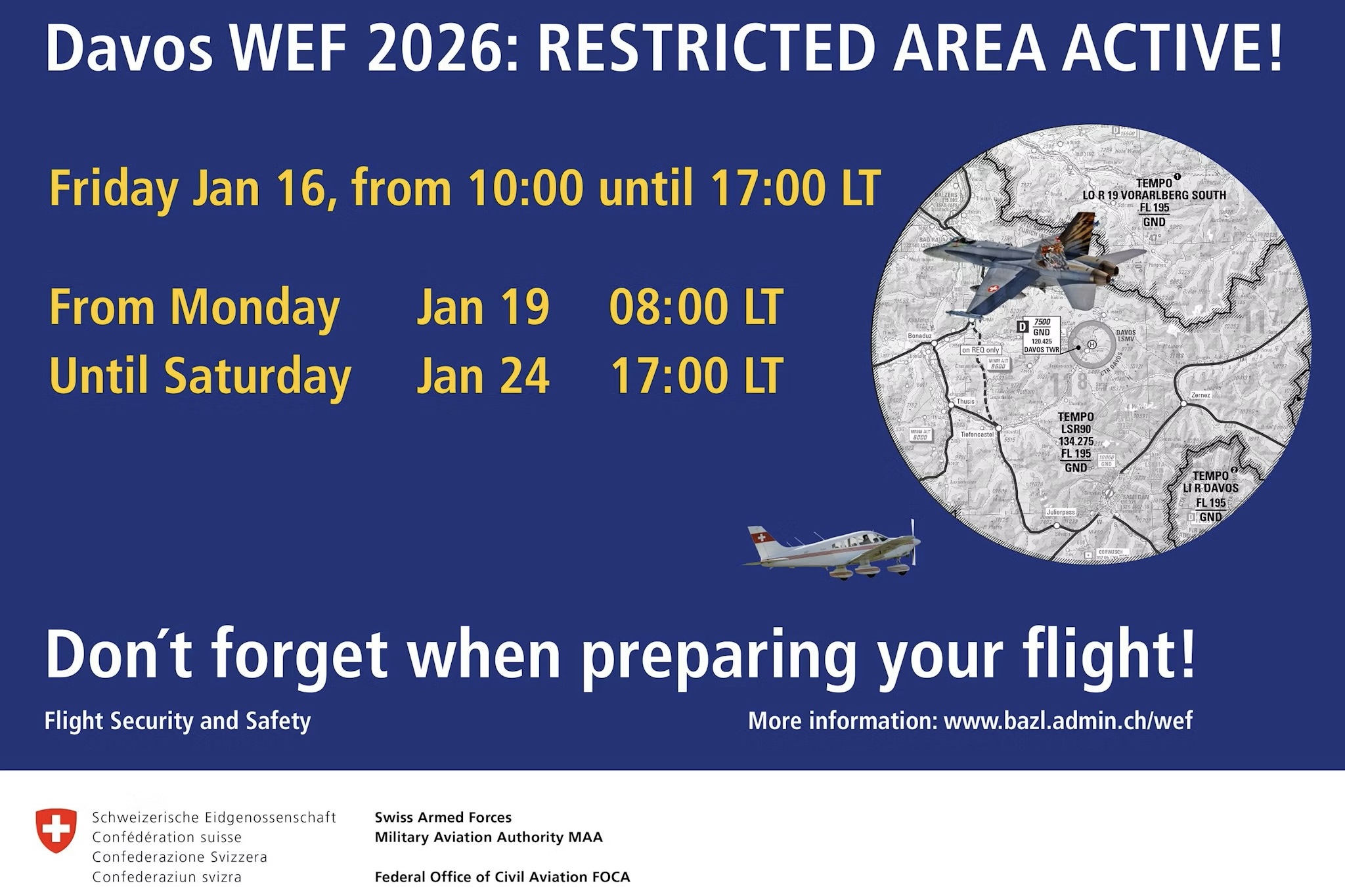 Le Forum économique mondial (WEF) se tiendra du 19 au 23 janvier 2026 à Davos. A cette occasion, diverses mesures de sécurité seront prises sur demande du gouvernement grison. Parmi ces dernières, la décision du Conseil fédéral de limiter l'accès à l'espace aérien et aux aérodromes dans la région de Davos du 16 au 24 janvier 2026. Les Forces aériennes suisses ont été mandatées par le Conseil fédéral pour assurer, durant cette période, la sauvegarde de la souveraineté aérienne.
