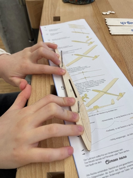 Die Kinder bekamen Balsaholz-Flieger zum Zusammenbauen. Mit grosser Sorgfalt, Geduld und viel Konzentration machten sich alle an die Arbeit und setzten die Modelle Schritt für Schritt zusammen.